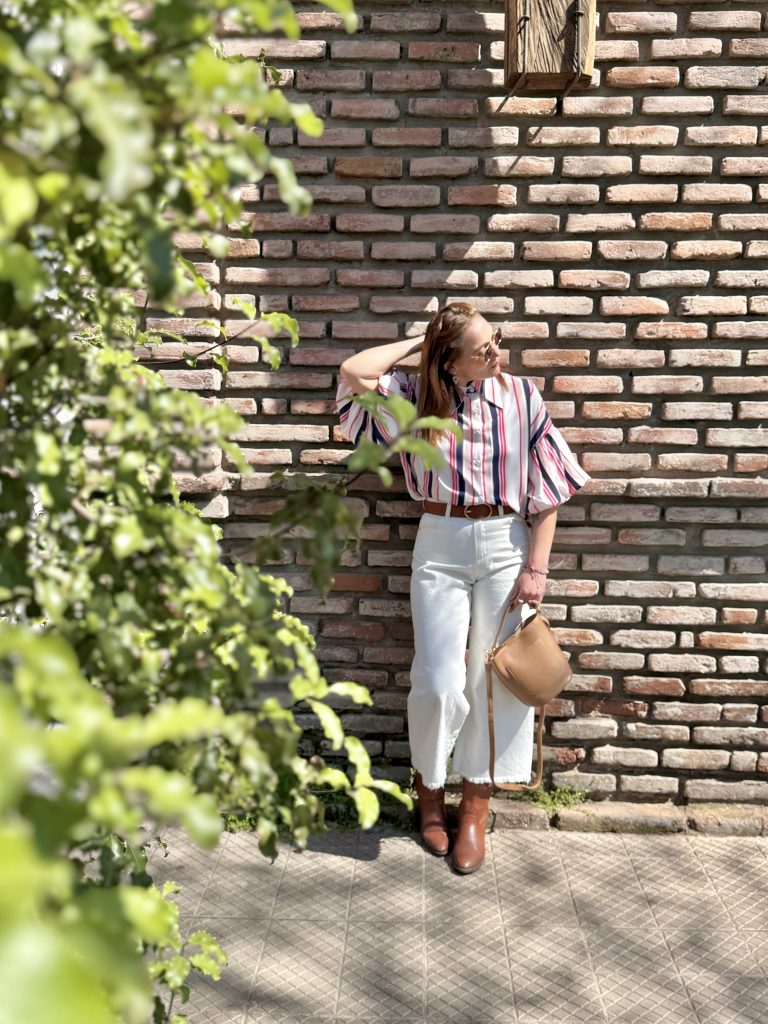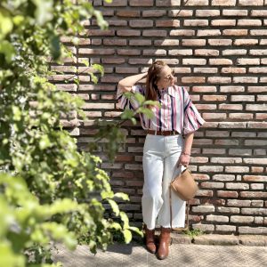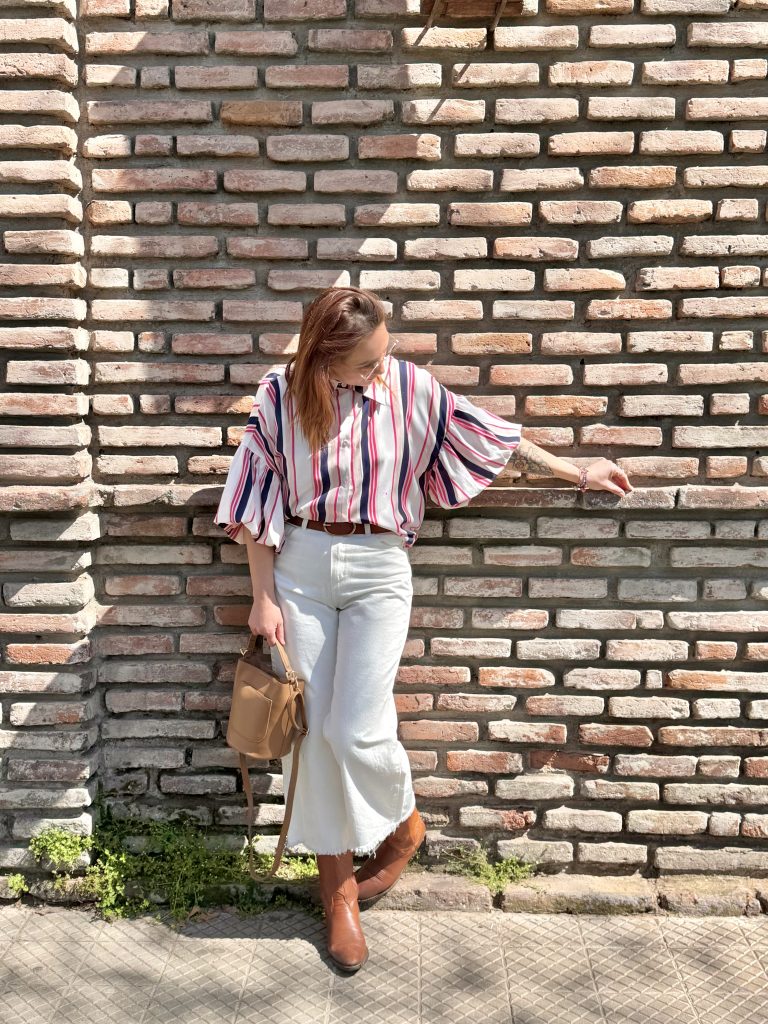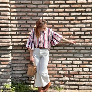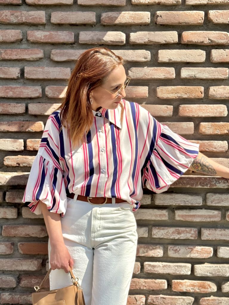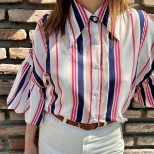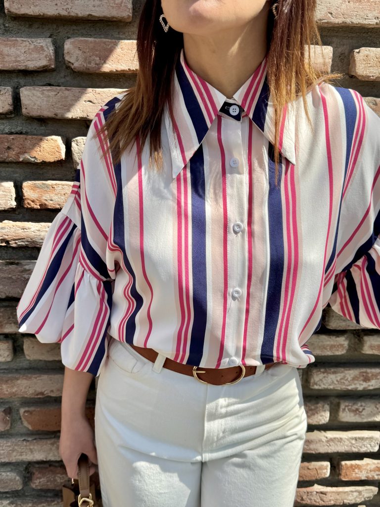 Blusa a rayas, exquisita su textura, de cuello largo, overzise de viscosa y expandes.